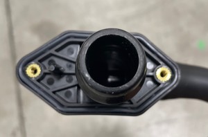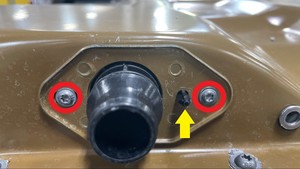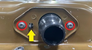 - Quite los pernos (2 uds.) que fijan el tubo de salida del sistema de conversión de energía a la cubierta de acceso frontal de la batería de alta tensión y retire el tubo de la cubierta.