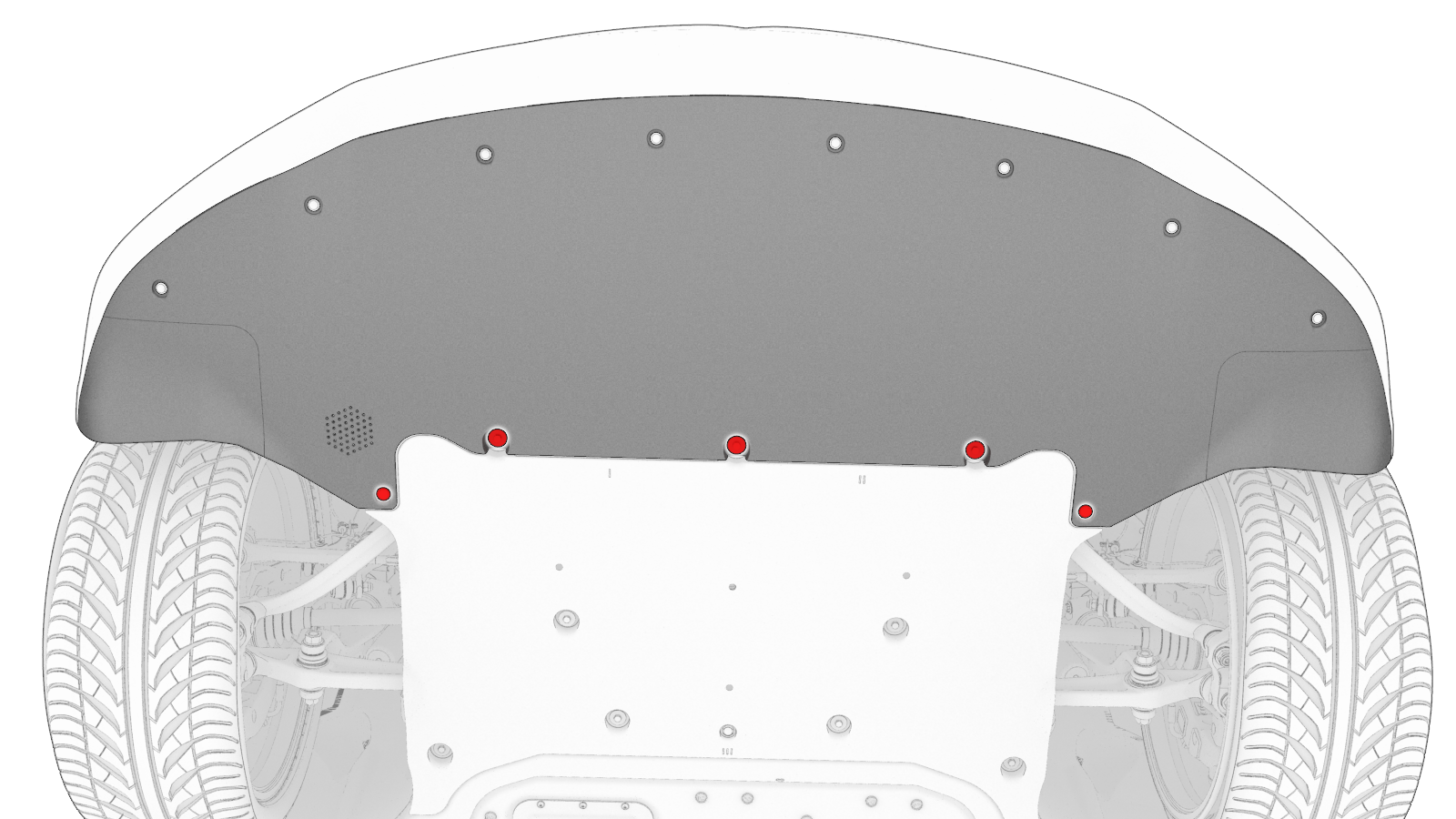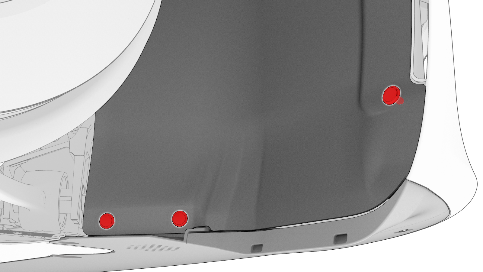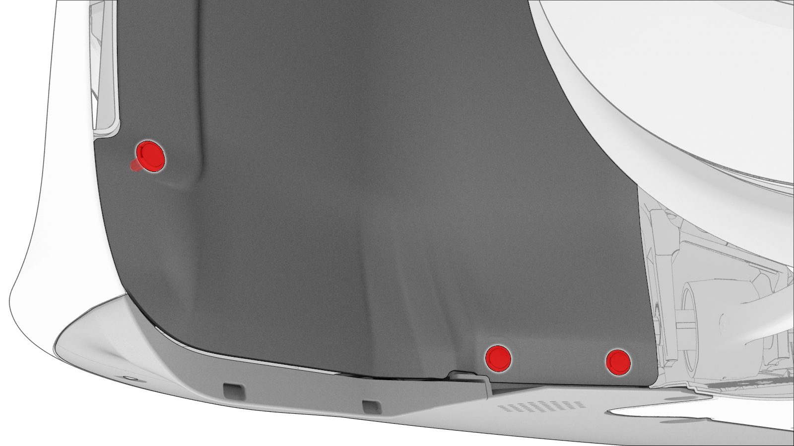 - Coloque los tres clips que sujetan el revestimiento del paso de rueda izquierdo a la faldilla y a la defensa delantera.