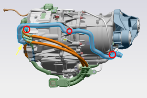 Retire la manguera que va del tren de transmisión trasero al inversor delantero.