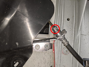 Retire el perno superior central que fija la aleta guardabarros delantera izquierda al soporte del panel lateral.