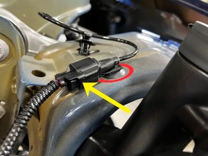 - Enchufe el conector eléctrico en línea del sensor de velocidad de la rueda delantera izquierda y, a continuación, fije el clip.