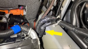 - Dirija el mazo de cables del amortiguador delantero izquierdo hacia dentro desde el paso de la rueda y, a continuación, apriete el clip.