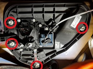 Notax2 datumsNotaStart by lining up the datums on the charge port with the charge port door, and then proceed to thread in all bolts.NotaNew charge port will come pre-applied with Penetrox. - Secure the charge port manual release cable onto the body.