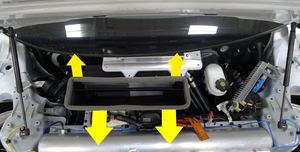 - Retire ambos recipientes de refrigerante del interior del área del vano del motor.