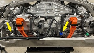 - Suelte los clips (9 uds.) que sujetan la manguera de entrada del inversor de la unidad de tracción trasera al bastidor auxiliar trasero y, a continuación, retire la manguera de la parte delantera del bastidor auxiliar.