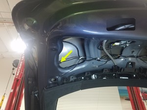 - Instale el mazo de cables del sensor antiatrapamiento del portón trasero izquierdo en el portón trasero y, a continuación, fije el pasacables.