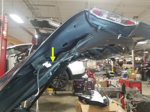 - Mueva el conjunto del sensor antiatrapamiento del portón trasero izquierdo alrededor del parachoques y, a continuación, aléjelo del portón trasero para extraerlo del vehículo.