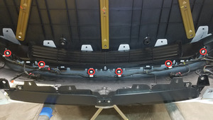 Retire los tornillos (2 uds.) que fijan la rejilla de la defensa delantera al conjunto de la defensa delantera.