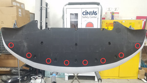 - Suelte las pestañas (11 uds.) que sujetan la rejilla de la defensa delantera al conjunto de la defensa delantera y, a continuación, retire la rejilla del conjunto.
