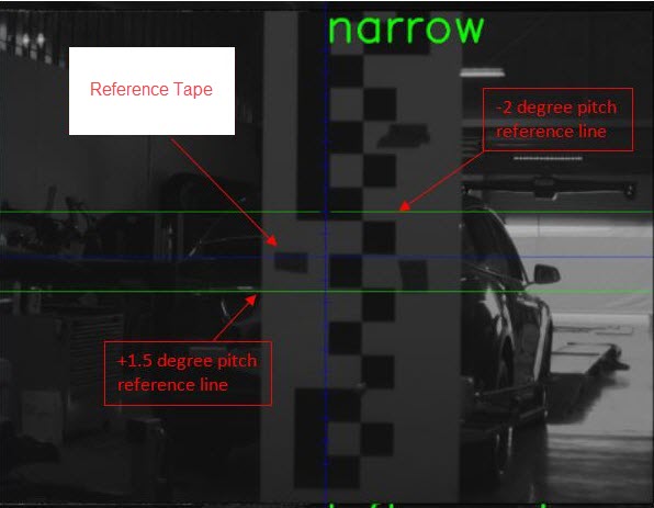 RemarqueLe haut du ruban de référence doit se trouver entre les deux lignes vertes. La ligne verte supérieure est à -2,0 degrés et la ligne verte inférieure est à + 1,5 degrés. _x000a_ Si le haut du ruban n’est pas entre les deux lignes vertes, continuez l'ajustement si la machine est équipée d’un support de tangage ajustable.