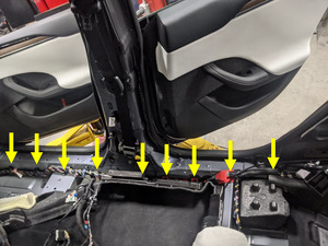 Retirez les boulons qui fixent l’avant des glissières du siège avant droite au panneau de plancher