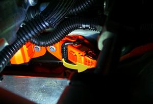 - Release the fir tree clip that attaches the A/C compressor logic harness to the A/C compressor HV harness bracket.