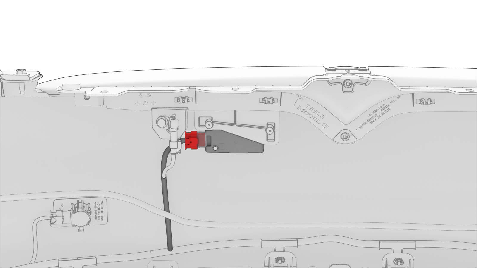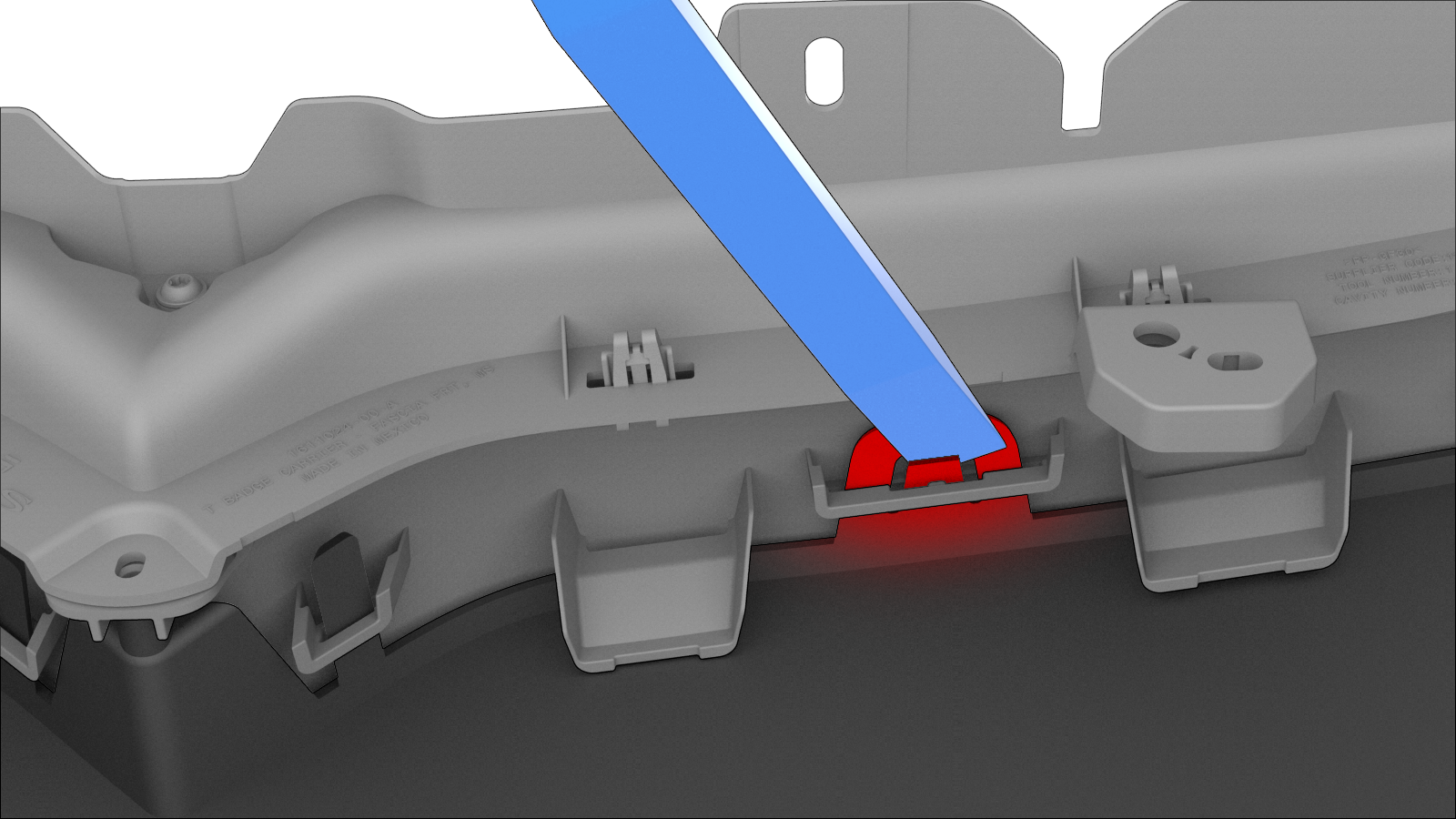 - Dégagez les languettes du support de l’écusson T du carénage avant, puis retirez le support de l’écusson T du carénage avant.