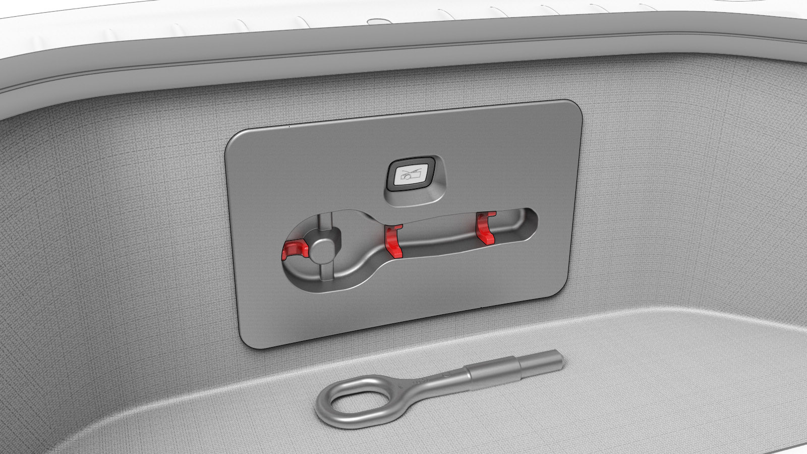 - Retirez l’œillet de remorquage du panneau d’accès de l’unité de rangement sous le capot.
