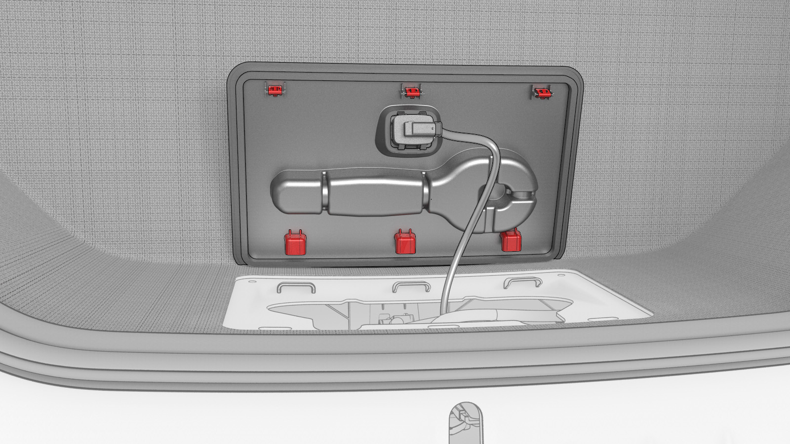 - Placez le panneau d’accès de l’unité de rangement sous le capot dans l’unité de rangement sous le capot, puis branchez le connecteur électrique.