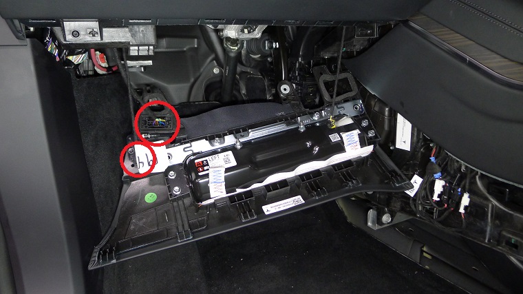 ATTENTIONLe coussin gonflable de genoux du conducteur est toujours connecté au véhicule. Attention à ne pas endommager les connecteurs électriques en abaissant le coussin gonflable depuis le tableau de bord.