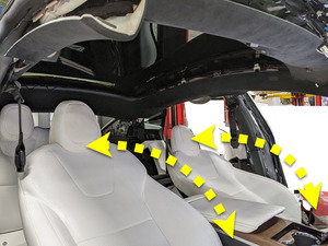 Détachez les attaches (x18) et les crochets (x2) qui fixent la garniture de toit à la carrosserie.