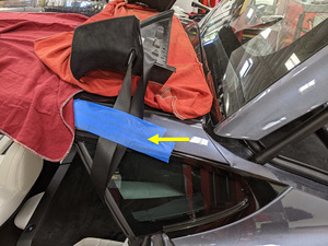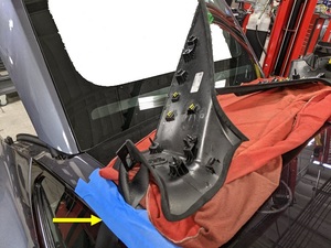- Retirez les garnitures supérieures de montant A, côtés gauche et droit. Voir Garniture - montant avant - supérieure - gauche (retirez et remplacez).