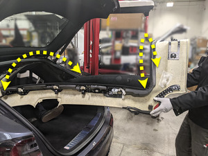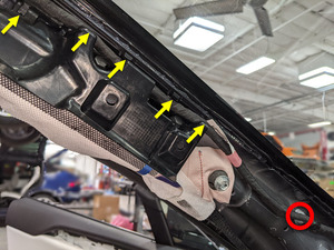 - Détachez les attaches (x7) qui fixent la garniture supérieure du montant C gauche, puis mettez la garniture de côté. Répétez cette étape pour la garniture de droite.