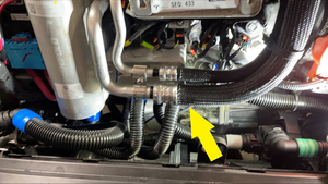 - Défaites l’attache, débranchez du supercollecteur le tuyau reliant l'échangeur thermique de l'unité d'entraînement avant au supercollecteur, puis bouchez immédiatement les deux raccords.