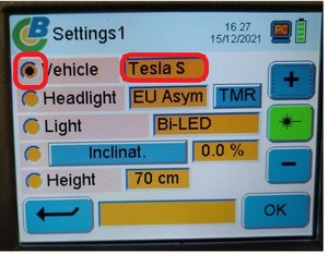 Sur le volant, utilisez la molette de défilement gauche pour régler le faisceau. Lorsqu'il est ajusté selon les spécifications, la couleur de l'indicateur de faisceau sur l'outil de test des phares passe du rouge au vert.