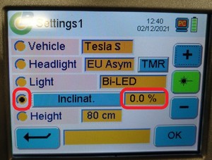 - Sélectionner Inclinat. (Inclinaison), puis utilisez le bouton + ou - pour régler l'inclinaison à 0,0 %.