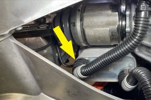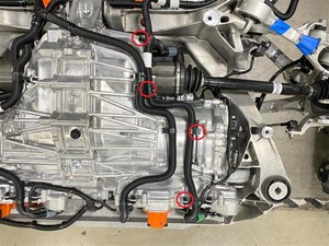 - Install the rear drive unit RH inverter to heat exchanger hose to the subframe assembly, and then fasten the clips (x4) that attach the hose to the rear drive unit.