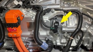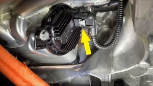 - Slide the red locking tab, raise the black handle up, and disconnect the RH HV harness from the rear drive unit RH inverter.