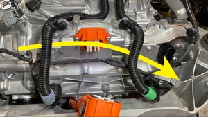 - Release the clips (x5) that attach the rear subframe harness to the LH inverter area.