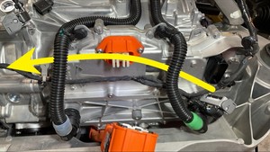 - Carefully route the rear subframe harness under the coolant hoses to the rear drive unit centerline, and then remove the harness from the subframe assembly.