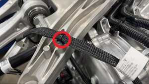 - Install the rear subframe harness onto the rear drive unit centerline, and then route the harness to the left and right under the coolant hoses.