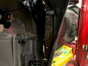Posez et serrez à la main le boulon intérieur qui fixe l’aile avant gauche à la carrosserie.