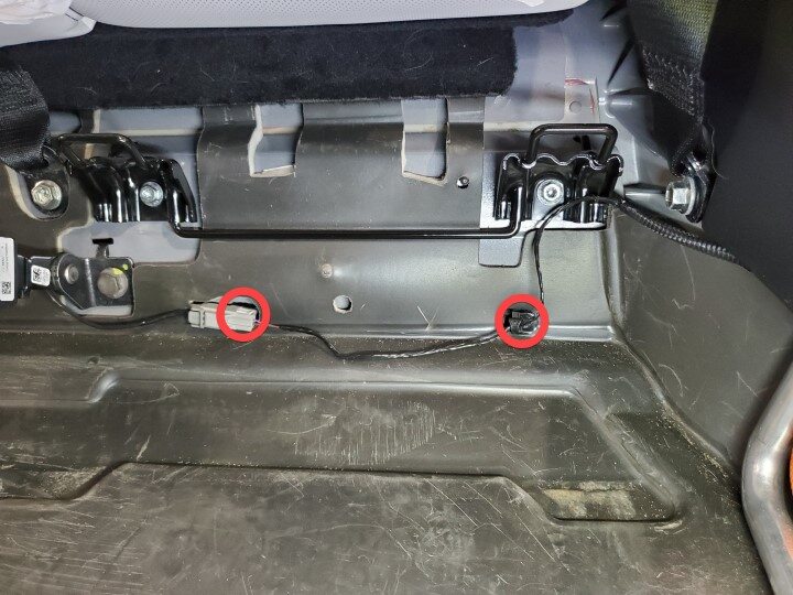 - Remove the 2nd row lower seat cushion. See Coussin de siège - inférieur - appuie-tête - 2e rangée (retirez et remplacez).