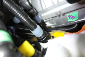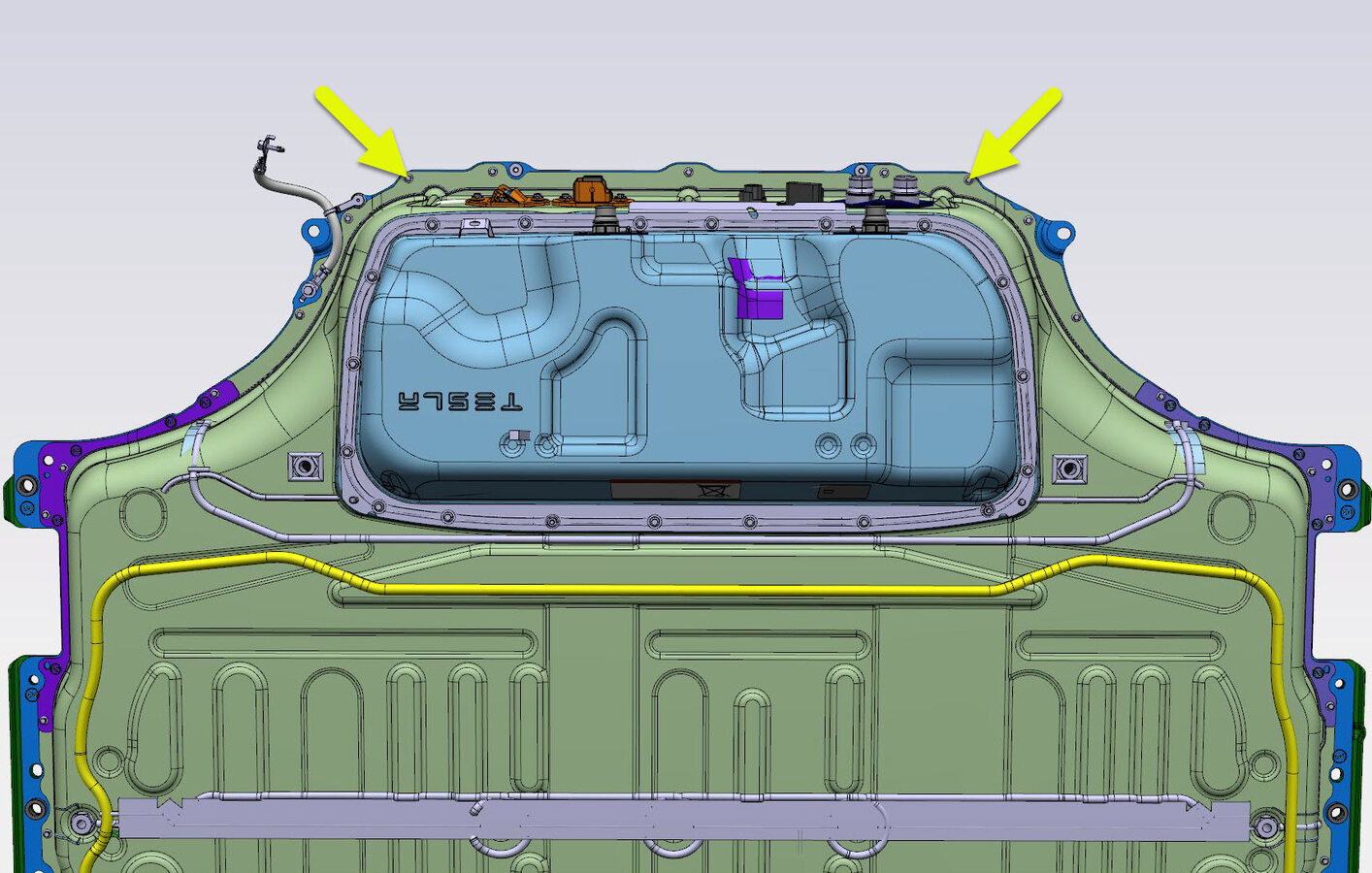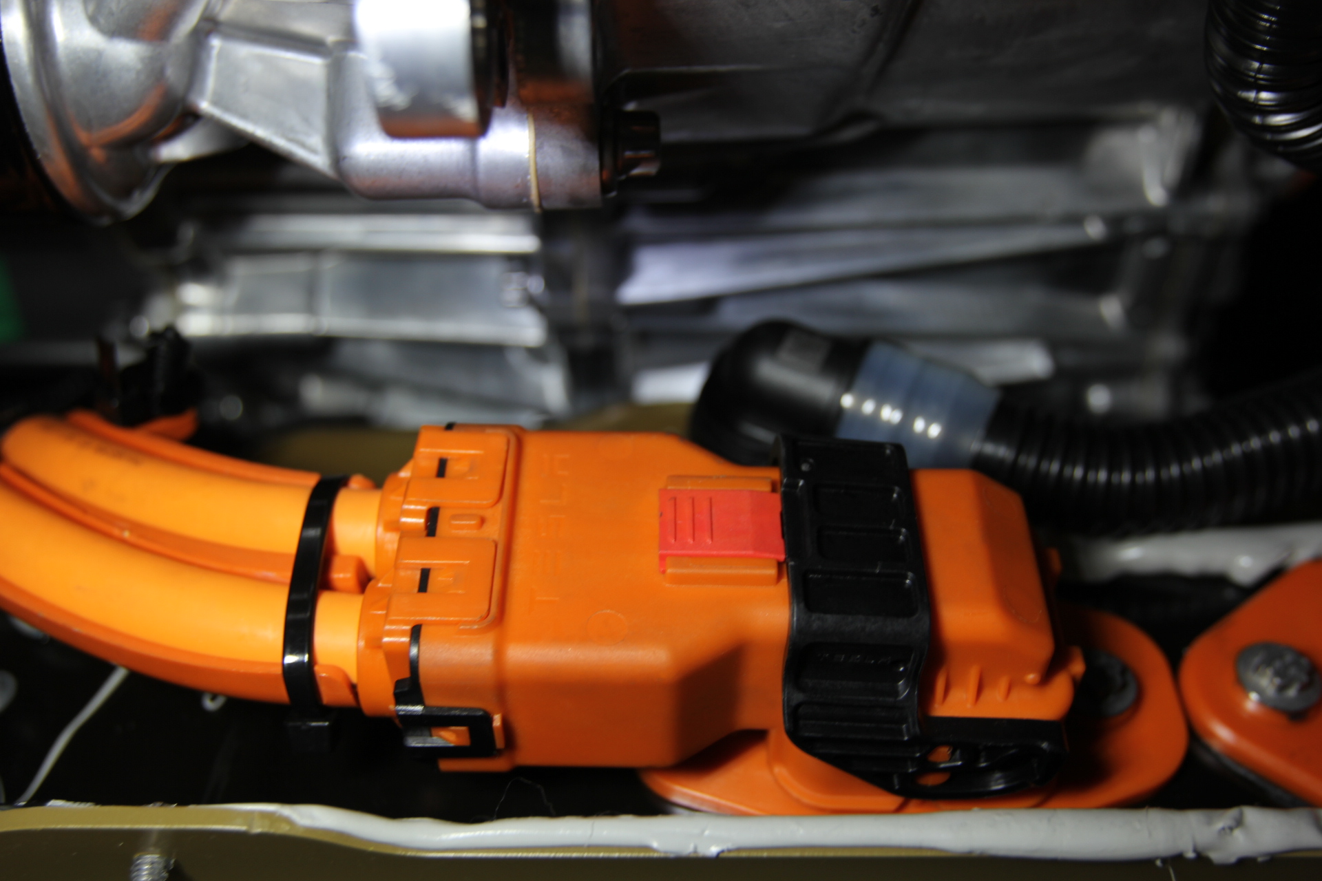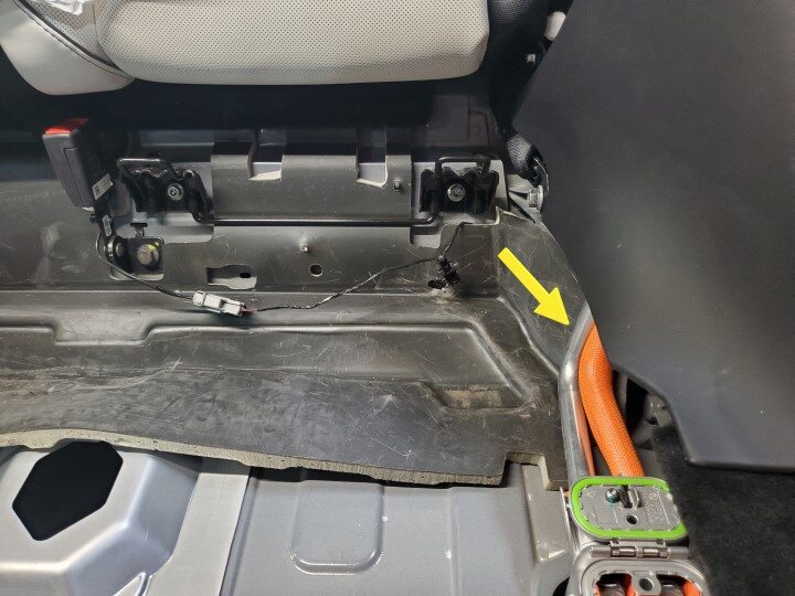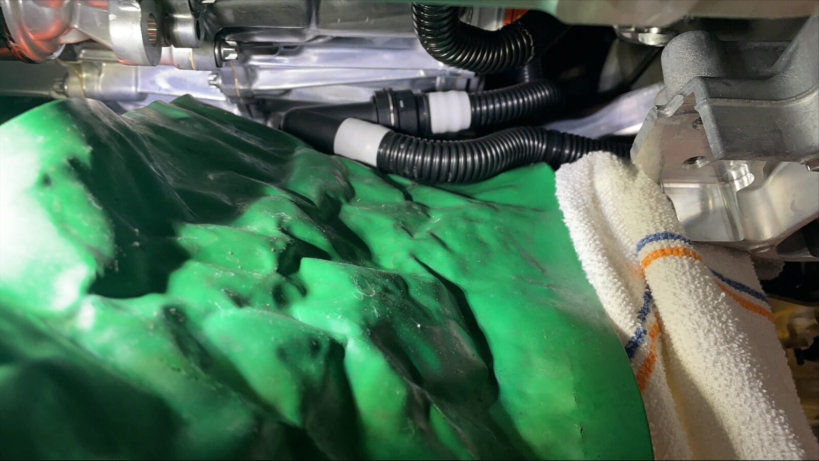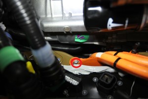- Plaid vehicles only - Place a foldable funnel and absorbent material over the HV harness connectors and under the power conversion system coolant return hose to direct coolant away from the HV battery.