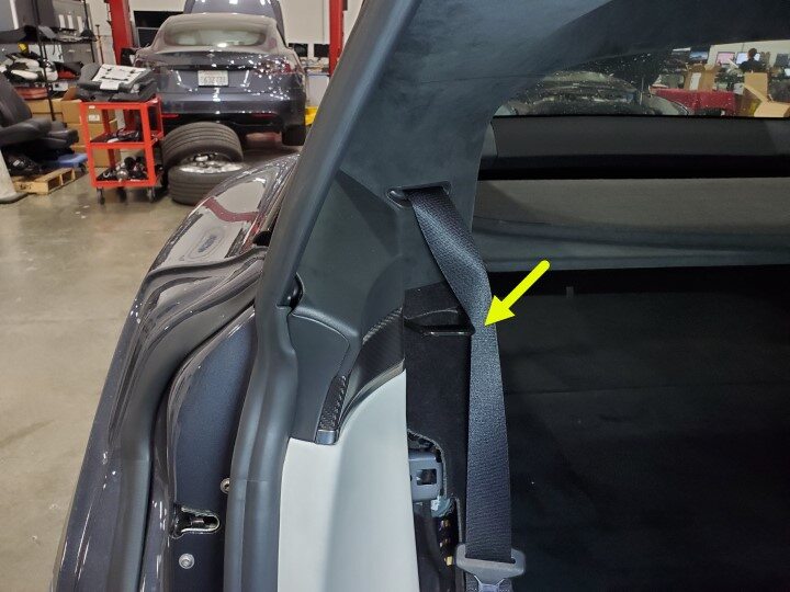 RH 2nd row seat belt behind the seat back, and then move the seat back to the upright