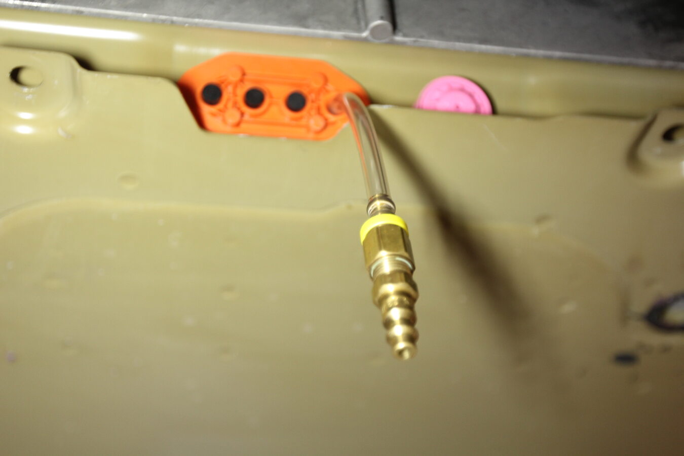 - Release the clip and disconnect the power conversion system coolant return to LH sill hose from the LH sill hose, and then immediately plug the fittings.
