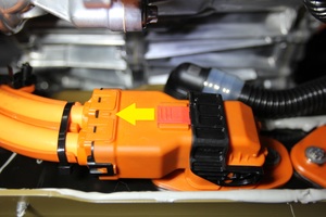 - Release the locking tab, and then disconnect the power connector to the HV battery.