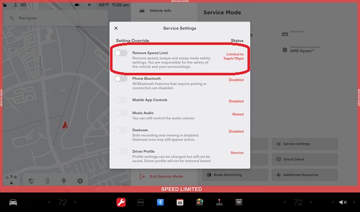 - Désactivez la « Limite de vitesse » sur l'écran tactile : Touchez Service > Paramètres de service > Supprimer la limite de vitesse.