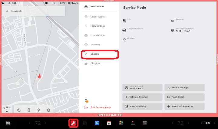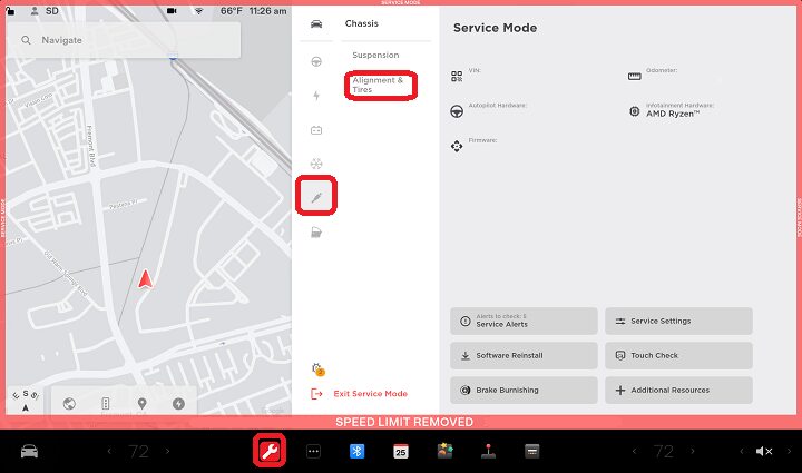 Accédez au portail d'alignement : Touchez Service > Châssis > Réglage de la géométrie et pneus.
