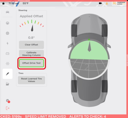 Touchez Service > Chassis > Réglage de la géométrie et pneus > Test de conduite décalée > Exécuter, puis conduisez le véhicule en ligne droite sur 500 m, à une vitesse d'au moins 30 km/h (18 mi/h).