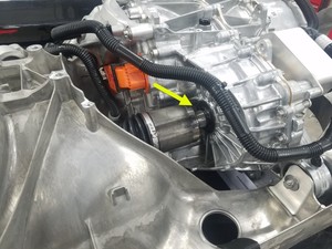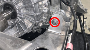 - Connect the rear subframe electrical harness to the rear drive unit resolver connector, fasten the locking tab, and then fasten the clips (x2) that attach the electrical harness to the rear drive unit motor.