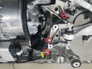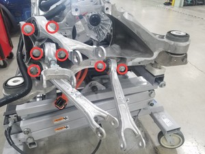 - Remove the bolt that attaches the rear drive unit to the rear of the rear subframe.