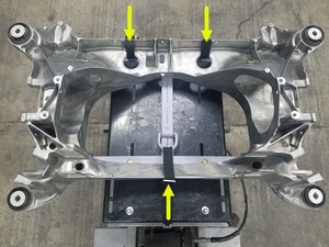 - With the help of an assistant, install a new rear subframe onto the subframe lift and then attach one strap at the front, and two straps at the rear of the subframe lift to secure the subframe to the subframe lift..
