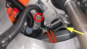 - Release the clips (x2) that attaches the rear subframe electrical harness to the rear drive unit motor, release the locking tab, and then disconnect the electrical harness from the rear drive unit resolver connector.