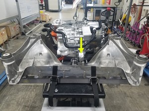 - Use the gantry to lower the drive unit sling tool and carefully set the rear drive unit into the rear subframe, routing the HV harness and coolant hoses as needed.