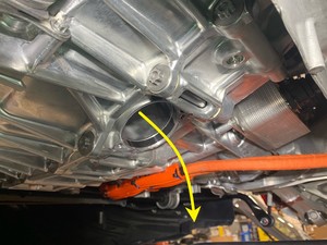 플라스틱 트림 공구를 사용하여 오일 필터 어셈블리 주변을 조금씩 들어 올려 녹색 O링이 보일 때까지 후륜 구동 장치에서 분리하고 구동 장치에서 필터를 탈거한 다음 기어박스 오일이 배출되도록 합니다.