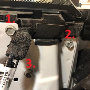 전면 LH 쿼터 글라스 가이드 레일을 도어 미러 어셈블리에 고정하는 볼트(2개)를 장착합니다.