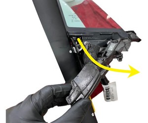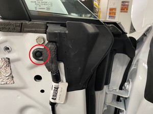 - 도어 미러 어셈블리 전기 커넥터를 연결 해제한 다음 전기 하네스를 도어에 고정하는 클립을 풉니다.