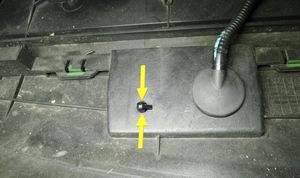 - 클립의 리테이닝 암을 눌러 외기 온도 센서를 분리한 다음 센서를 아래쪽으로 분리하여 액티브 그릴 셔터 어셈블리에서 탈거합니다.