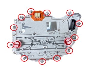 - 후륜 구동 장치 LH 인버터를 후륜 구동 장치 LH 기어박스에 고정하는 볼트(12개)를 탈거한 다음 기어박스에서 인버터를 탈거합니다.